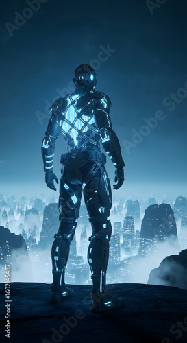 Cybernetic Figure Overlooking Bioluminescent Cityscape