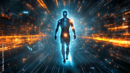 Cybernetic human with radiant blue and orange energy glowing in a futuristic space