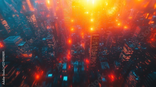 Cyberpunk city aerial, fiery sunset, futuristic buildings, glowing lights, digital art