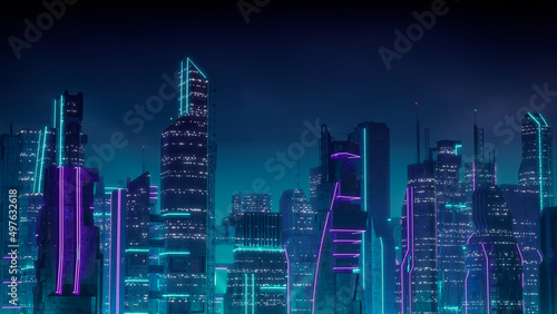 Cyberpunk City Skyline with Purple and Cyan Neon lights. Night scene with Visionary Superstructures.