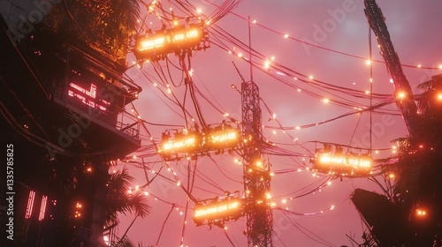 Cyberpunk city with neon lights and tangled wires creating futuristic scene