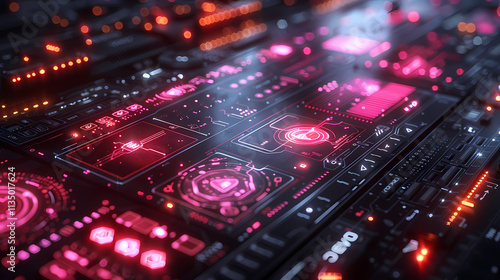 Cyberpunk Control Panel: Close-up view of a futuristic, intricately designed control panel, glowing with vibrant red and pink neon lights.
