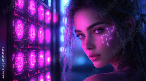 Cyberpunk girl leaning on glowing tech panel