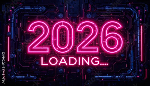 Cyberpunk neon 2026 loading screen with futuristic digital circuit board background