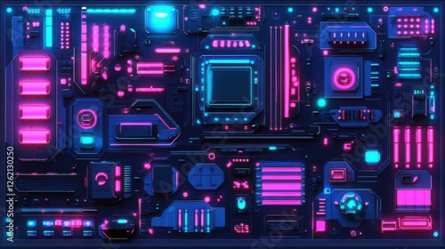 Cyberpunk neon circuit board with glowing pink and blue elements, sci-fi digital aesthetics, high resolution