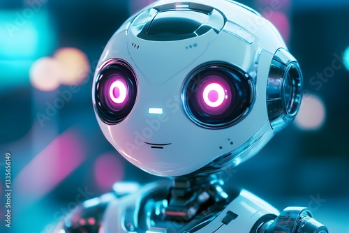 Cyberpunk robotic head close-up featuring neon lights, mechanical details, and a futuristic design. High-tech AI with metallic plating, perfect for digital art, gaming, and sci-fi projects.