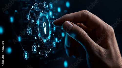 Cybersecurity: A hand reaches out to unlock a digital security system, representing protection, access, and control in a network of interconnected data points. The blue hue evokes trust and reliabilit