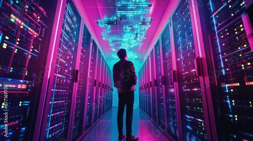 Cybersecurity analyst intensely examining a firewall hologram in a neon-lit server room, displaying deep concentration. Cybersecurity service