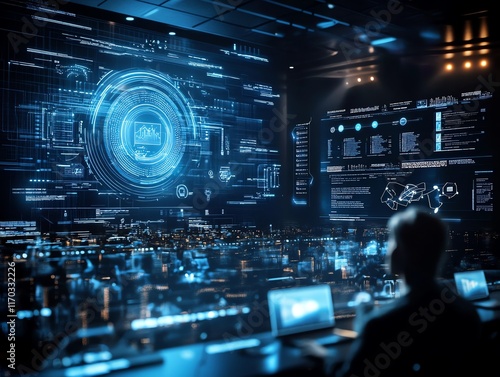 Cybersecurity Analyst Monitoring Futuristic Digital Interfaces