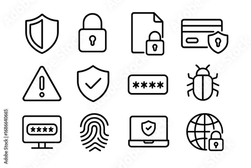 Cybersecurity and data protection line icon set. Vector outline icons for safety, privacy and encryption. Lock, shield, password, fingerprint and bug symbols. Web security.
