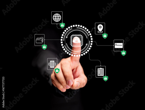 Cybersecurity authentication concept. Businessman pressing fingerprint scan on virtual screen for secure access to personal data, files, devices, online transactions, and location services.