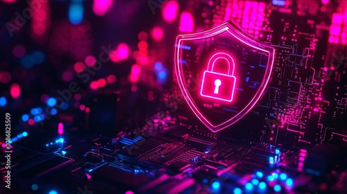 Cybersecurity concept with digital shield and lock icon in glowing neon pink