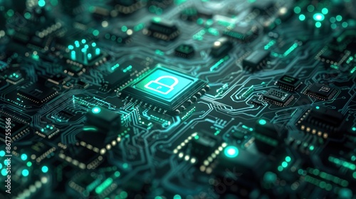 Cybersecurity Concept with Lock Icon on Circuit Board - High-tech illustration of a lock icon on a glowing circuit board, symbolizing cybersecurity and digital protection.