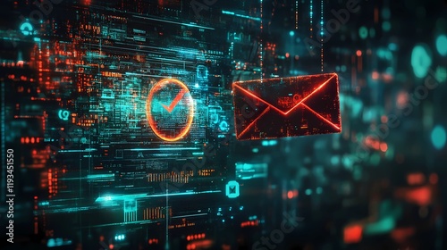 Cybersecurity concept with locked email icon ensuring safe data sharing and encrypted electronic communication, digital protection theme, book illustration style