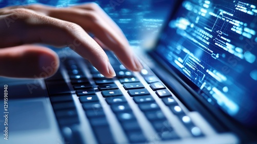 Cybersecurity, Data Processing, and Digital Innovation, A Close-Up of Hands Typing on a Laptop with Glowing Code on the Screen