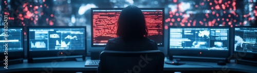 Cybersecurity expert analyzes complex data on multiple monitors for threat detection