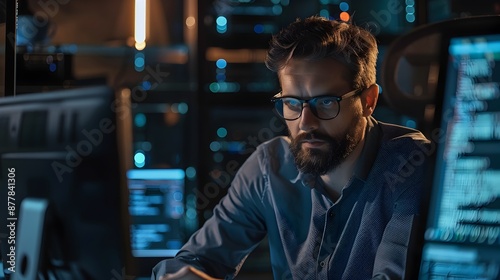 Cybersecurity Expert Analyzing Code in Workspace at Night