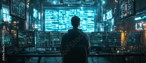 Cybersecurity expert demonstrating anonymous communication methods, with secure hardware, encrypted software, and a hightech, modern backdrop