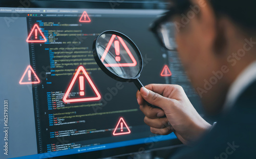 Cybersecurity expert detects critical vulnerabilities with magnifying glass, highlighting urgent threat to data safety and online security solutions