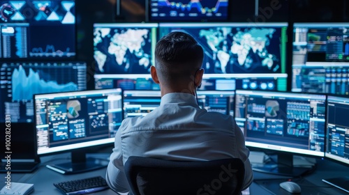 Cybersecurity expert monitoring network traffic for potential threats on multiple screens with copy space