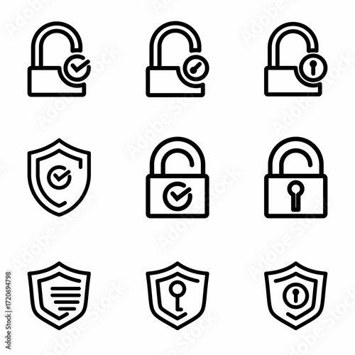 Cybersecurity Icon Set, Digital Security and Protection, Shield and Lock Icons, Safety and Privacy Symbol Collection