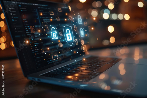 Cybersecurity, Icons Floating Over Laptop Screen.
