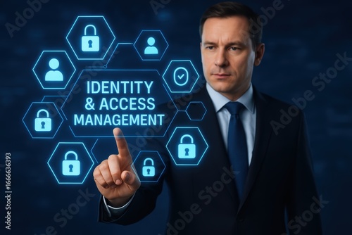 Cybersecurity Sentinel: A focused professional stands before a luminous display showcasing 'Identity & Access Management', symbolizing modern data protection and digital security.