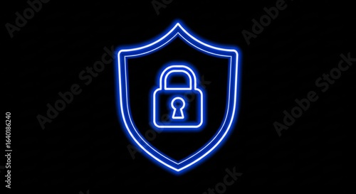 Cybersecurity shield and padlock glowing in neon blue on black background for protection