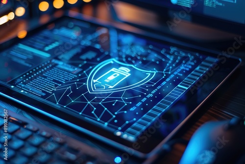 Cybersecurity shield emblem on a tablet screen with keyboard and mouse. Soft ambient light. Modern office background.