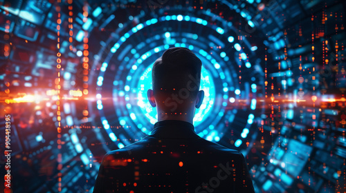 Cybersecurity specialist is standing looking at a futuristic technological interface with glowing lights and binary code