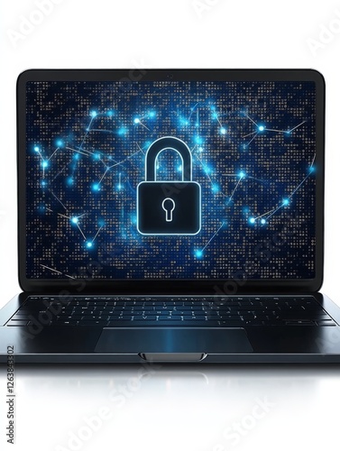 Cybersecurity themed futuristic laptop with glowing digital lock hologram and circuit board connections symbolizing data protection, network encryption, and online privacy in high tech concept