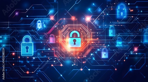 cybersecurity visualization with lock icons and data encryption grids, glowing background,