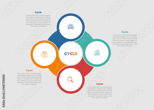 cycle and circular shape business process infographic diagram with big circle with circle badge on top with 4 step for slide presentation
