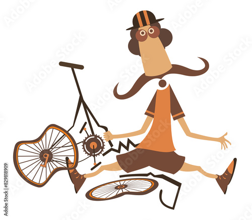 Cyclist man falling down from the bicycle. Cartoon long mustache cyclist man in helmet sitting near a broken bicycle. Isolated on white background