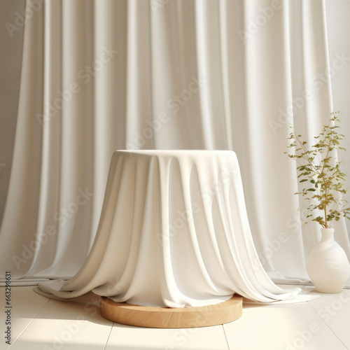 Cylinder podium covered with cloth on silk white background. Premium empty fabric pedestal for product display.