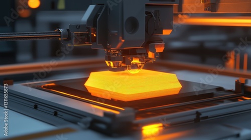 D printer working on a prototype in an industrial facility, glowing layers of material forming futuristic designs.
