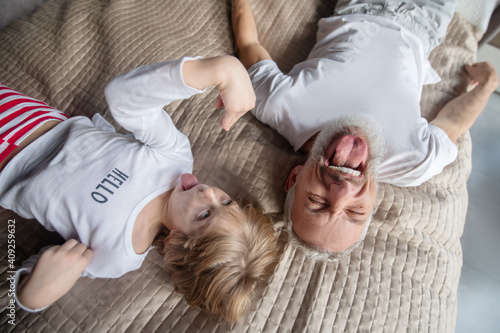 Dad and kid with funny grimaces on bed