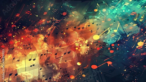 Dadaism background with abstract musical notes and vibrant colors softly illuminated
