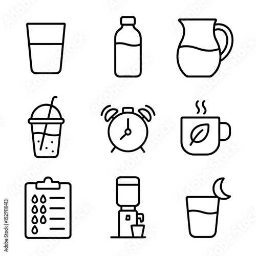 Daily Hydration Icons. Outline icon set of daily hydration routine: morning glass, afternoon bottle, evening jug, smoothie cup,