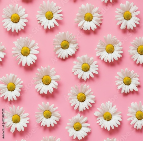Daisy pattern on a pink background. The photo symbolizes the joy of spring and natural beauty through a minimalistic arrangement of white daisies on a pastel pink background.