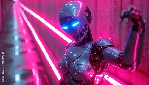 Dancing alien robot on a metal background with bright neon lights ,generative ai