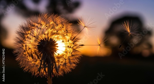 Dandelion Seed Dispersal at Sunset with Golden Light