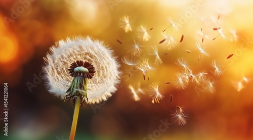 Dandelion Seed Whispers: A close-up view of a dandelion clock, its delicate seeds caught in the wind against a warm, sunny background, symbolizing wishes and new beginnings.