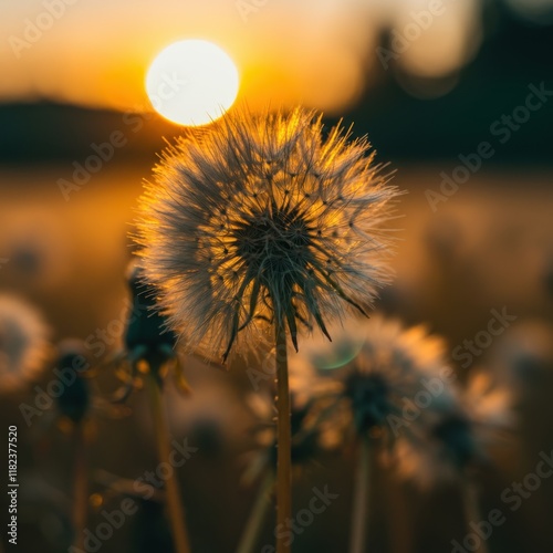 dandelion seedheads at sunset, golden hour light, bokeh background, shallow depth of field, macro photography, warm tones, nature close-up, ethereal atmosphere, silhouette, backlit, dreamy, soft focus
