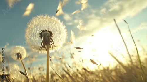 Dandelion seeds being carried by the breeze, with a focus on the seed head and a sunny sky behind, no people.