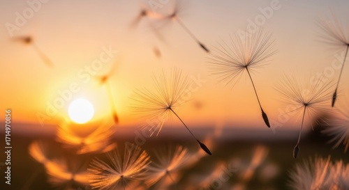 Dandelion seeds blowing in wind, delicate dandelion seeds highlighted by warm sunlight at sunset. Dandelion seeds, symbols of fragility and freedom, drifting through air.