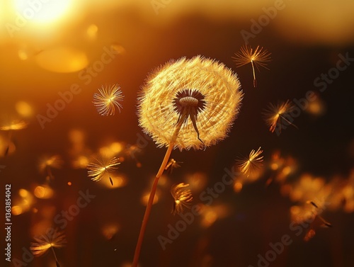 Dandelion seeds floating in wind with backlit golden hour and negative space on left
