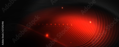 Dark abstract background with bright color neon lights and lines. Glowing background
