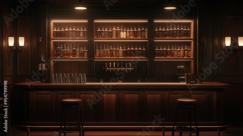 Dark and Moody Bar with Whiskey Bottles, Wooden Counter, and High Stools - Hyper-Realistic Canon EOS R5 Style. AI generated illustration