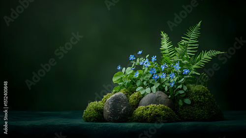 Dark Background Arrangement Of Moss Ferns And Blue Flowers